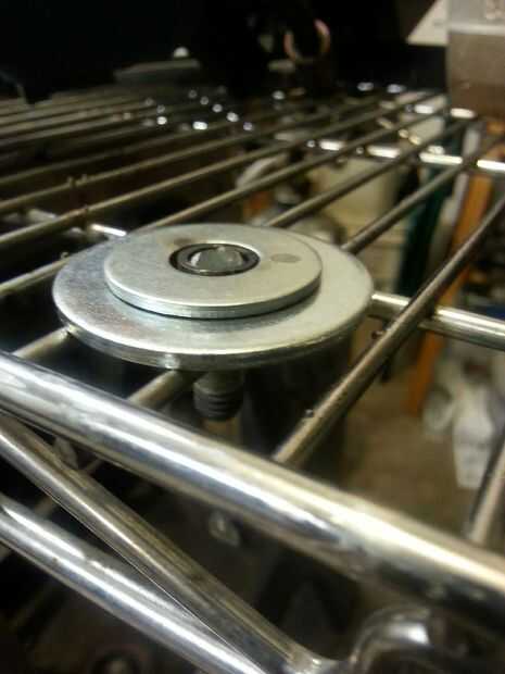 Coloque la arandela grande sobre la superficie de soldadura. Centro de la Asamblea/del tubo dentro de la arandela grande como se muestra. Tachuela Suelde la varilla roscada al tubo de acero. Puede ser más fácil soldar con autógena un pedazo en un extremo de la varilla roscada para mantenerlo lugar.