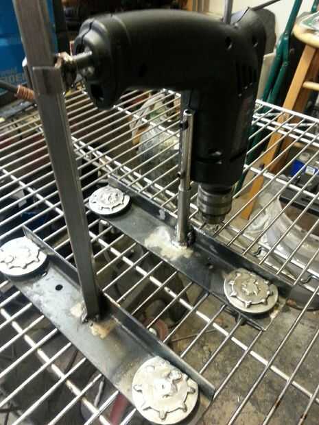 La imagen de arriba muestra un conjunto de abrazaderas instalado en la base de una máquina de golpear ligeramente que estoy trabajando pero también los he usado con una sola pieza de hierro de ángulo. Emparejado con un pedazo perforado/ranurado de hierro de ángulo puede utilizarse para colocar componentes en la mesa de soldadura o como una guía de taladro. Si te fijas bien en la imagen, verá que he perforado agujeros en ángulo de hierro y cortar una plana en la arandela más grande para evitar que gire.