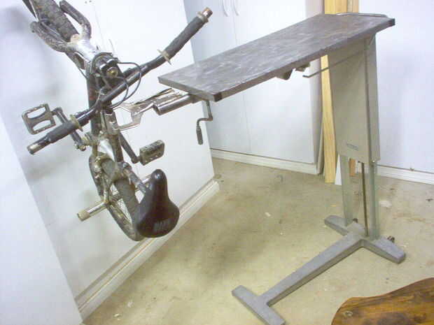 Soy alta, por eso he querido un stand de trabajo de bicicleta que era versátil, como tenían en la tienda de bicicletas local, y que me conseguiría el suelo cuando necesite trabajar en algún ciclo. También, quería hacer una mesa de soldadura, y un chico mencioné que "Haría altura ajustable de la mina", dijo. Así, cuando vi a la vieja mesa en la tienda...