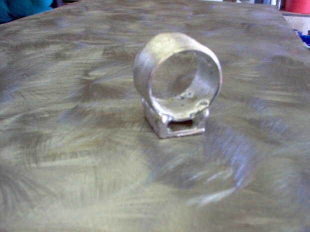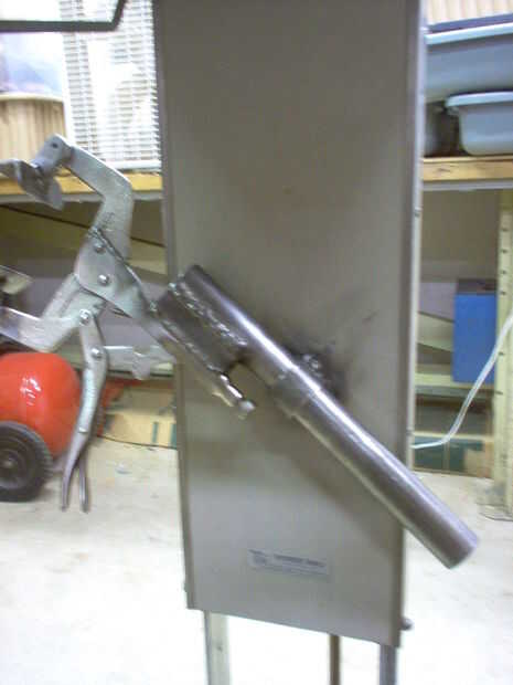 He utilizado el final de la chatarra que se corta de la tubería que utiliza para el soporte. Primero esta soldada a una sección de acciones de canal (primera foto). Entonces, tierra de la pintura sobre la tabla soporte soldado con autógena el ensamblaje del tubo en un ángulo.