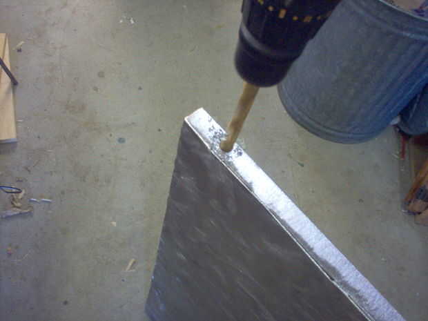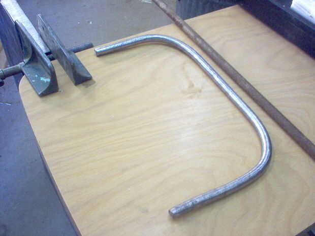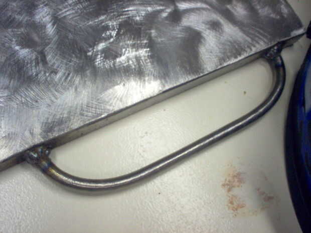 Medidas de los agujeros para las manijas en la parte posterior de la tabla, luego les perforado (1/2" de la barra de acero de 1/2"). Por último, me cortar los extremos a la medida y soldó con autógena el mango a la mesa. La última foto es el mango acabado después de amolado y lijado por las soldaduras.