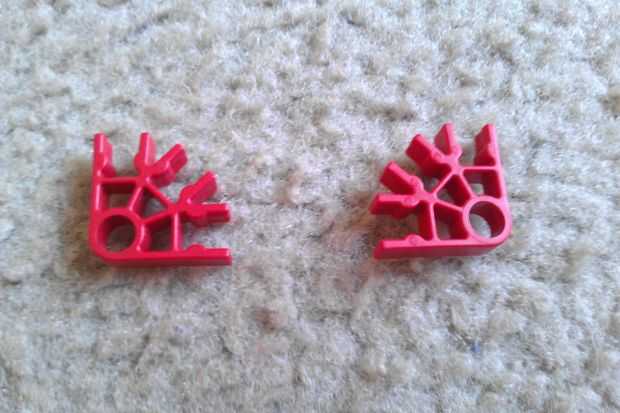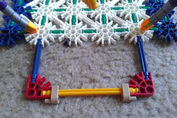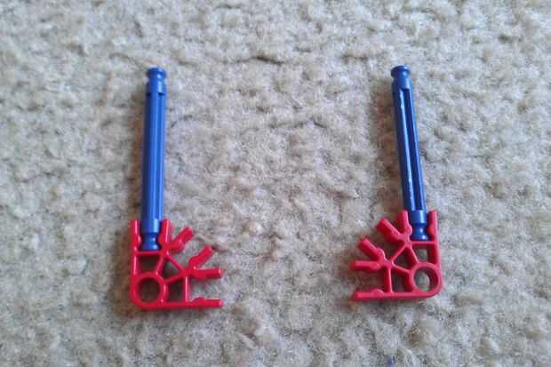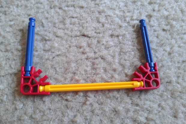 Tomar dos conectores rojo y sujete a dos barras azul. A continuación, conecte las dos piezas con una varilla amarilla. Por último, añadir dos cerraduras de rotación tan a la barra amarilla que le gire.