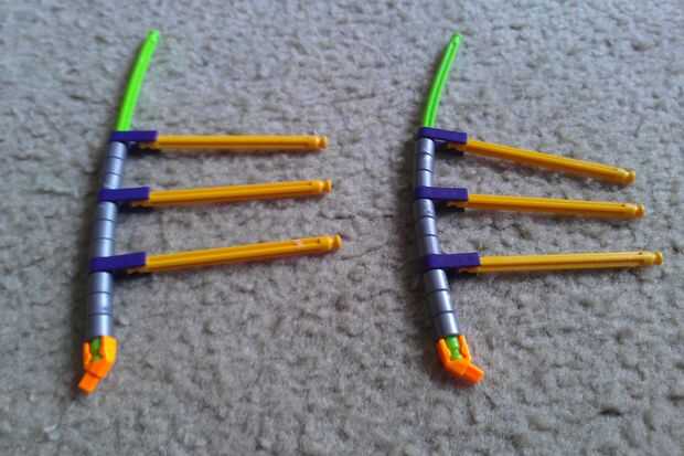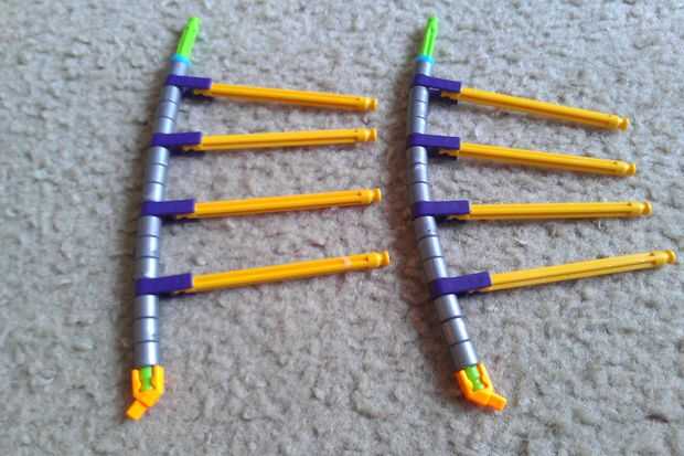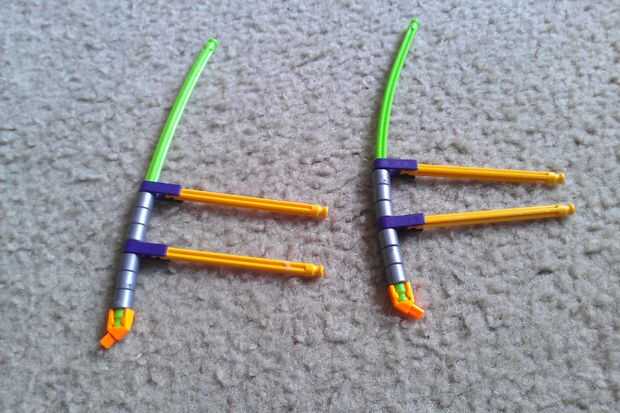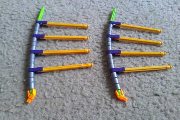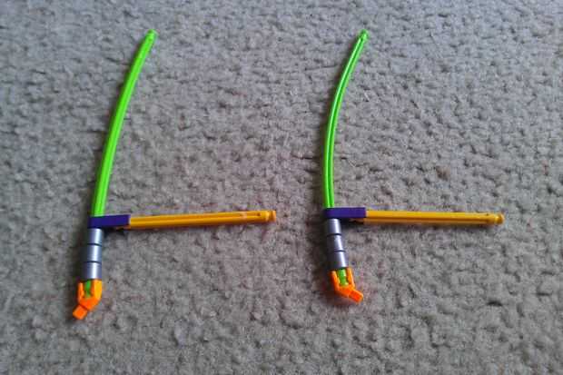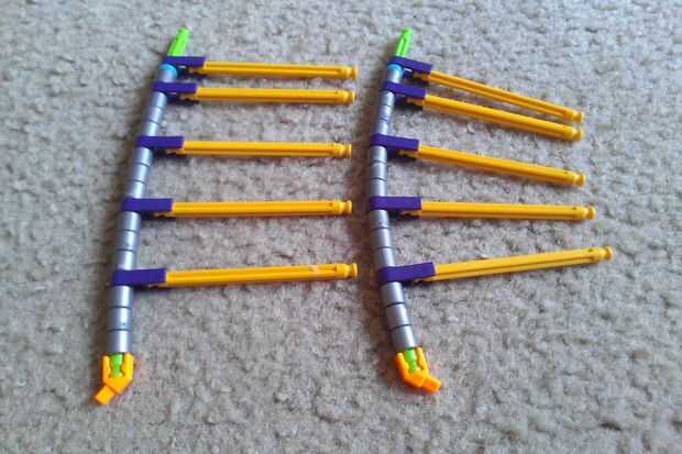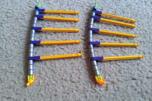 Deslizar tres separadores gris a cada una de las barras verdes de bendy, luego agregar una de las piezas en el paso siete. Repite este patrón total de cuatro veces en cada barra verde. Después de la cuarta repetición, deslice un separador gris y un separador azul en la barra verde y fije la pieza final. Por último, añadir un casquillo azul a cada barra verde.