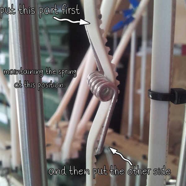 Así que puse una de la parte final de la primavera entre dos engranajes de la correa (ver la foto de abajo) y, manteniendo la parte central de la primavera en el lado de no engranaje, que al otro lado del final de la primavera entre los engranajes de la correa.