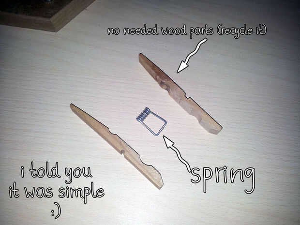 Primero tenemos que desmontar la pinza para la ropa, tener las dos piezas de madera y la primavera media.