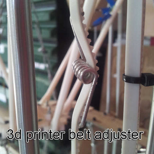 Im construir una impresora 3D aquí en el Fab Lab León (España), y tengo que ajustar la tensión de las correas. El principal problema es que el edificio de im de modelo es un Max de Rostock, por lo que las bandas tienen cerca de 1 metro de alto (3,2808 pies) y a pesar de realmente exprime firmemente antes de poner la correa en los cojinetes, usar brida para unir las dos partes de la correa (como se puede ver en la primera foto, la parte de plástico negro).