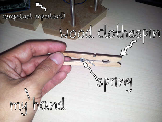 Aquí en España (y en la mayor parte del mundo, supongo) la pinza está compuesta por dos piezas de madera se unió a un pequeño muelle en el medio. Bien, permite utilizar esta primavera pequeña a tensión la blet de impresora 3d.