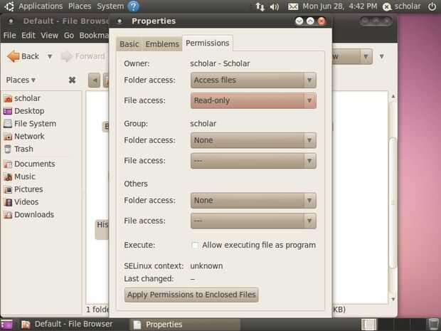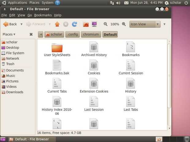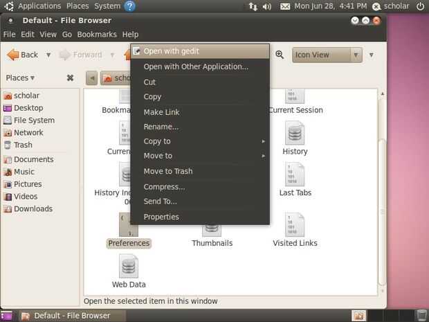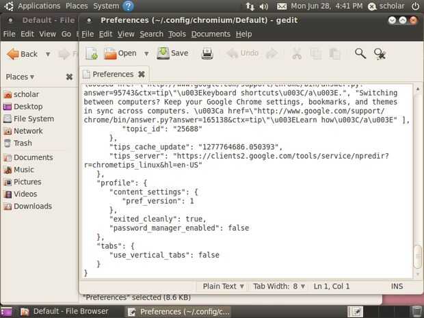 Tras el cierre de cromo lugares, haga clic en y haga clic en la carpeta de inicio de la barra superior. De la ventana resultante, haga clic en ver y mostrar archivos ocultos. Ahora debe ser capaz de ver una carpeta llamada ".config" abrir esto, encontrar cromo y abra la carpeta por defecto. Haga clic derecho sobre el archivo llamado Preferencias y elija Abrir con gedit. Luego, desplácese hasta la parte inferior y encontrar la opción "exited_cleanly": y cierto si no lo es ya. Guarde y cierre este archivo en gedit. Subir una carpeta haciendo clic en el botón de cromo en la parte superior del espacio blanco. Haga clic derecho sobre el archivo llamado "Estado Local" y asegúrese de que las líneas que comienzan con "top": e "izquierda": ambos tienen ceros después de ellos y antes de las comas. Continuación, haga clic en la carpeta predeterminada, seleccione Propiedades y haga clic en la ficha permisos. Seleccione archivos de Access en el cuadro en la parte superior de la ventana de propiedades de desplegable de acceso a carpetas, a continuación, seleccione sólo lectura en el desplegable de acceso a los archivos de caja justo debajo de la superior. Haga clic en cerrar una vez que estas opciones se han establecido, y cierran el explorador de archivos. Abrir una vez más cromo y asegúrese de que todas las opciones parecen ser correctas y que la historia no muestra para recién visitado páginas Web.