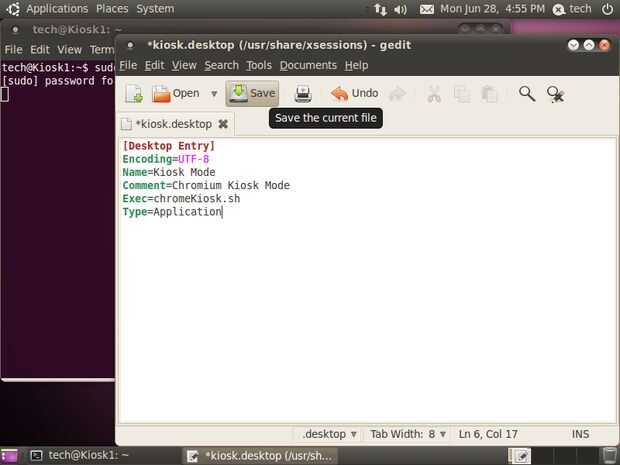 Guarde y cierre este documento y luego introduzca el siguiente comando en la ventana de Terminal: "sudo gedit /usr/share/xsessions/chromeKiosk.sh" Esto debe traer otra ventana de gedit para insertar el siguiente código:
