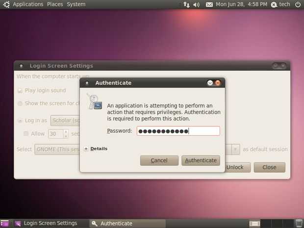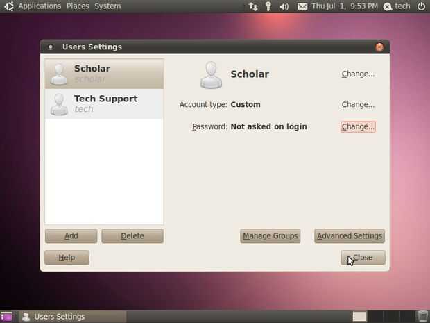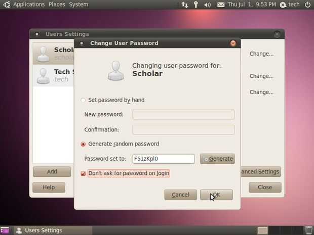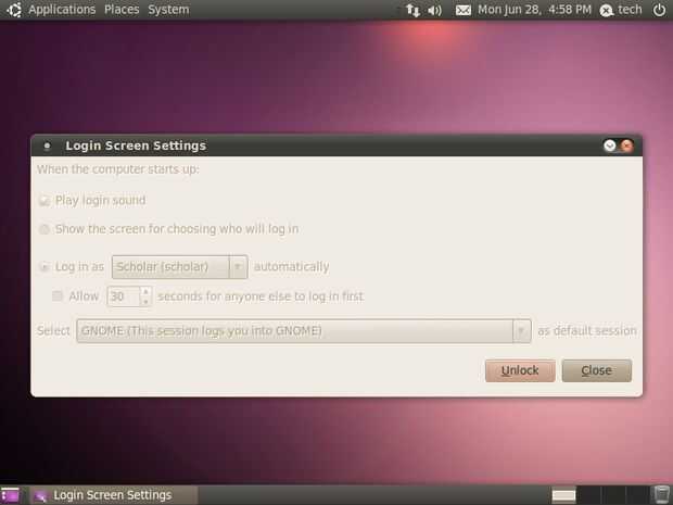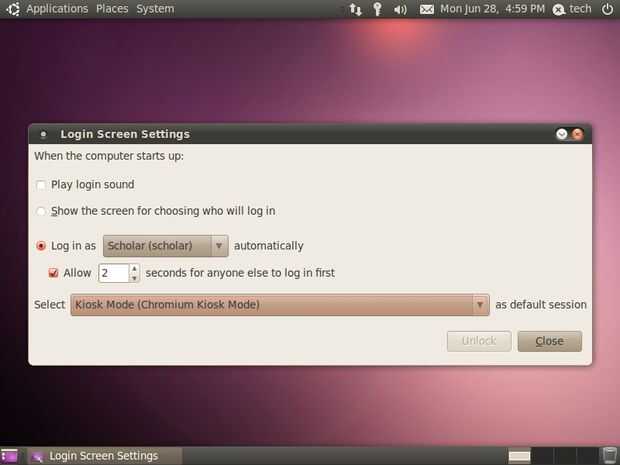 Siguiente es permitir que cualquier persona para ingresar a nuestra cuenta genérica y configurar el equipo para esta cuenta en el inicio de la carga. Primero haga clic en sistema, destacan administración y haga clic en usuarios y grupos. Esto debe traer una ventana que muestra dos cuentas disponibles en el sistema. Asegúrese de que su cuenta regular tiene la contraseña que pide al iniciar sesión así que nadie puede entrar y desordenar el sistema. Luego haga clic en su cuenta de usuario de invitado genérico (erudito en mi caso) y haga clic en el botón cambiar junto al campo contraseña. En la siguiente ventana aparece seleccione "generar la contraseña al azar" y marque la casilla para permitir inicio de sesión sin preguntar la contraseña. Después de hecho esto, cierre la ventana de configuración de usuario. A continuación, haga clic en sistema, luego resalte administración y por último, haga clic en pantalla de inicio de sesión. En la parte inferior derecha de la ventana de configuración de la pantalla de inicio de sesión que viene habrá un botón que dice desbloquear. Haz clic en este botón e introduzca su contraseña. Haga clic en autenticar, la ventana le permitirá hacer clic en las diferentes opciones disponibles. Seleccione iniciar sesión como su usuario restringido permitiendo nadie 2-5 segundos para iniciar la sesión en primera. Esto le permitirá realizar cambios si algo no está establecida en el futuro a la derecha. También seleccionar el modo de quiosco como la sesión por defecto y haga clic en cerrar.