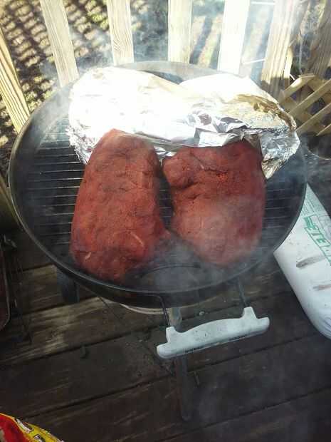 Bastante auto explicativa, coloque la carne sobre la bandeja de goteo. Si usted tiene una parrilla más pequeña como yo, usar un papel de aluminio para crear una pared va debajo de la carne en la parte superior sin tocar en la parte superior. Esto ayuda a un lado de la quema. Sobre a medio camino a través de cocinar giré la carne 180° por lo que el lado más cercano era el calor cerca del borde.