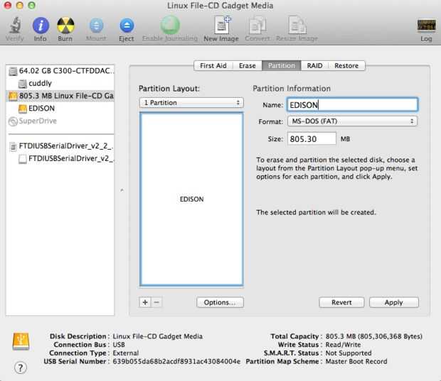 - Golpe "aplicar" y usted puede comprobar que su Edison ahora tiene una partición FAT32.