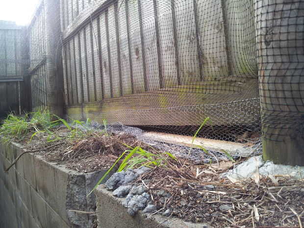 Encontramos la valla trasera no bastante llegar a tierra correctamente todo el camino, y nuestro gato siendo una excavadora para túneles habría encontrado una forma hacia fuera. Con algunos restos madera, alambre de pollo y la pistola de grapas cierran cualquier posibles rutas de escape.
