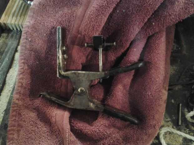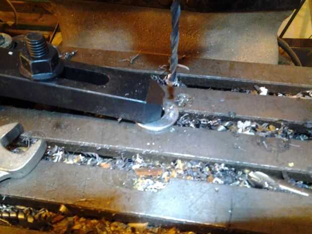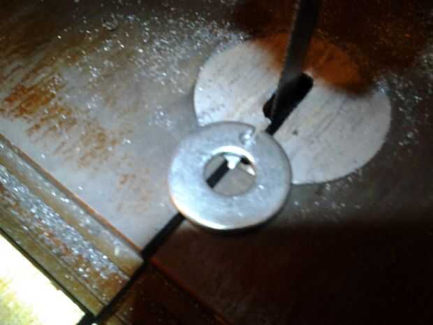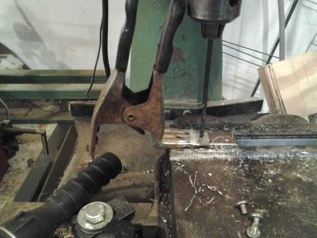 opté por usar una abrazadera de resorte como un mango y el cable tirando de mecanismo. Primero utilice una herramienta Dremel para cortar el resorte en la abrazadera. No necesitamos más resistencia. Luego corte otro pedazo de ángulo de 2" 3/4" de largo para formar un gran soporte en L. Dobla uno de los maxilares hacia abajo de 90 grados. Corte una ranura en la otra mandíbula para aceptar el extremo del cable. Doblar la punta de la mandíbula hasta menos 45 grados para mantener el cable se deslice fuera de la ranura. Taladro y toque un par de agujeros para atornillar la abrazadera en el soporte en L. Utilicé tornillos de #10. Taladro y toque otro par de orificios que servirán para montar el conjunto de abrazadera de resorte a la varilla de inclinación que hicimos en el primer paso. Utilice una arandela de 1/2" para la funda soporte de retención. Preparar por taladrar un agujero de diámetro de 0,210" medio camino a través de la lavadora. Utilizar una sierra para cortar una ranura para permitir que el cable se deslice del lado. Doble arandela en un tornillo de banco para que el soporte de la envoltura es a 90 grados desde el 1/4" tornillos de montaje. La Asamblea del perno a la barra de inclinación.