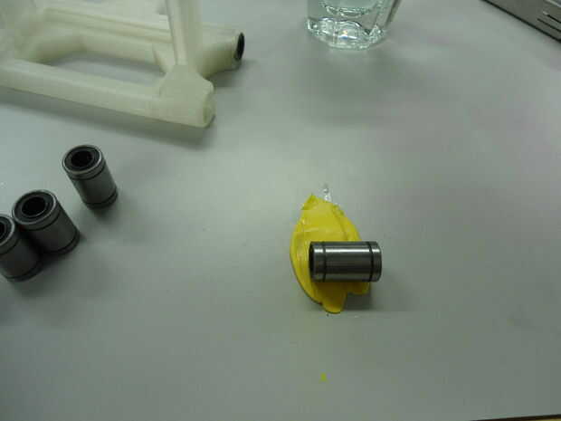 Usando uno de los rodamientos como un perno de balanceo de improvisados, poner una capa delgada de Sugru función como una especie de cuñas alrededor de los cojinetes.