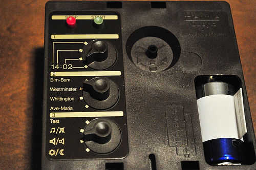 -Perilla 3 establece varias opciones. También esta uno no hace un sonido de confirmación. La primera posición hará un timbre de prueba completo con 12 "gongos" mientras el reloj está en marcha. Opción dos apaga el sonido (por defecto está en). Opciones de tres permite establecer uno de los dos ajustes de volumen (por defecto es fuerte). Cuarta opción desactiva el timbre por la noche (creo que... No probarlo) (por defecto es chime en todas horas).