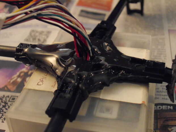 Como muchas personas esperando por sus piezas de recambio para llegar, hice una reparación temporal de la Cruz piezas con resina de plástico para sujetar las piezas en su lugar (no hacer un enlace muy fuerte) y luego cubriendo la zona central con JB Weld para darle soporte estructural. Esto fue un peso extra inferior en comparación con el moldeo por un soporte de PCL, y mucho más rápido que esperar varias semanas tarda Sugru curar lo suficiente para tomar la tensión. No espero que esto dure, pero quiere conseguir en el aire otra vez!