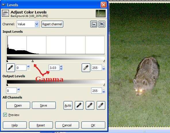 En medio de la ventana de niveles, se encuentra el campo de ajuste de gamma con la corredera de ajuste justo por encima de él. Deslizando el puntero es el gamma. Aumento de la gamma para aligerar las partes oscuras de la imagen sin afectar a los más ligeros demasiado.