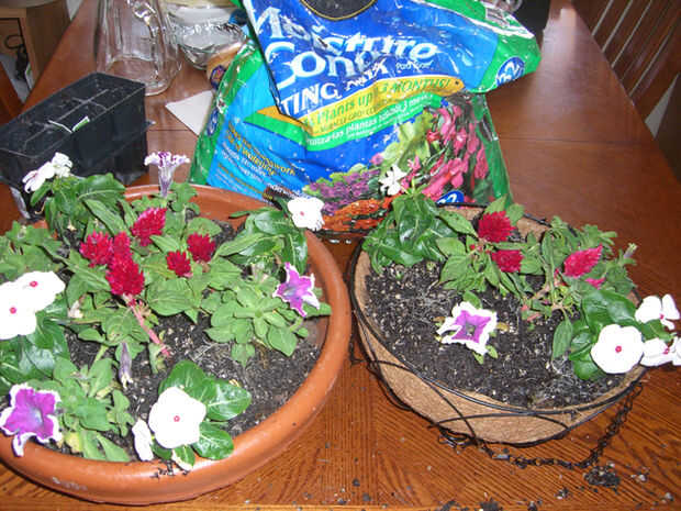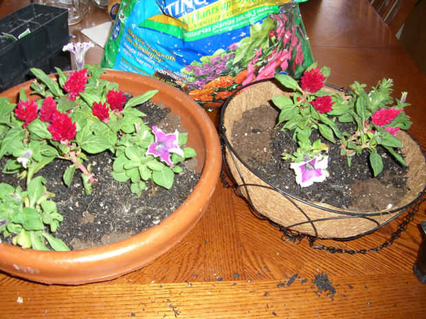Una vez que todas tus plantas están en su lugar añadir más macetas alrededor de los tazones de fuente de color para cubrir bien las bolas de raíz expuesta y presionar ligeramente para embalar el suelo en la parte superior.