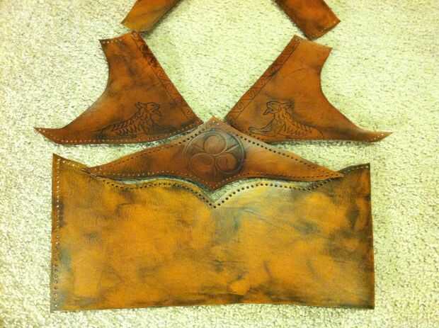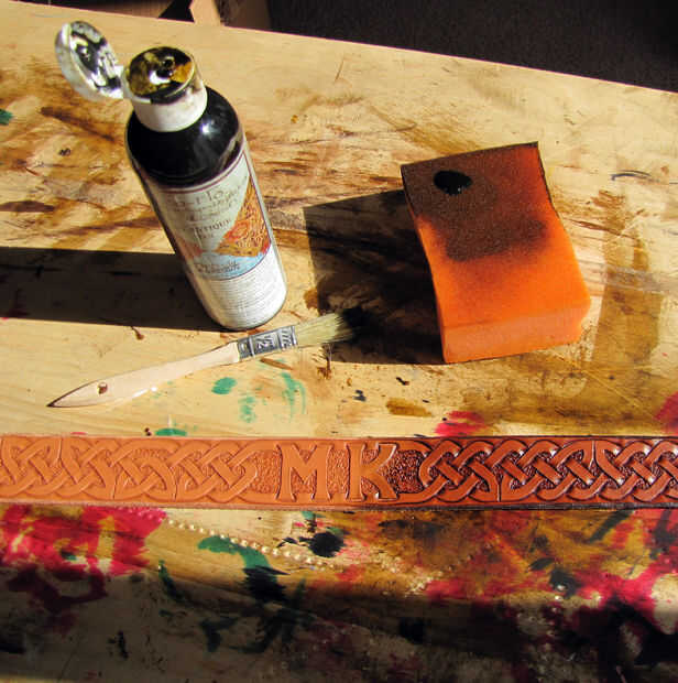 -Usando una esponja de alta densidad, aplicar gel de cuero antiguo en un remolino de movimiento (ver ejemplo de correa). Puede aplicar varias capas. Si se pone demasiado oscuro, utilice una esponja mojada en un movimiento de remolino a bajar algunos. Deje el gel antiguo en las hendiduras. Hará el diseño pop out.