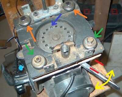 La foto muestra la parte superior de la Asamblea de motor yugo. La palanca que se aprieta el yugo para evitar la rotación izquierda o derecha durante el uso es el cromo brazo debajo de la flecha amarilla. Tire de él hacia la parte posterior de la sierra para aflojar el yugo por lo que se puede rotar. (Un pasador resorte cargado debe también levantado y sostenido. Hay más sobre el ajuste de este perno de lanzamiento más adelante en la discusión de la eliminación de talón). Observe las dos líneas rojas. Cuando la palanca está firmemente, la palanca debe estar detrás de la esquina del yugo por sobre la distancia entre las dos líneas rojas. Como la sierra, la palanca llegará más cerca y más cerca de la esquina del yugo yugo está apretado. Se puede ajustar. Observe la flecha azul. Puntos para un agujero particular en una rueda llena de agujeros. En este orificio hay un tornillo de bloqueo. Quitar con una llave de Allen debajo del yugo. Girar el volante con los orificios hacia la derecha uno o dos orificios y vuelva a insertar el tornillo de abajo. El mango ahora debe bloquear el yugo con la cantidad apropiada de espacio antes de que sea demasiado cerca de la esquina.