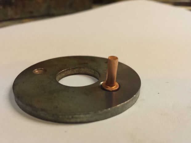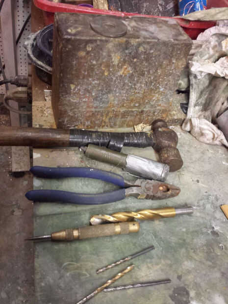 Al fijar los remaches colocar el remache del yunque en un bloque de acero grande en mi banco. En un apuro, funciona una superficie de madera sólida, pero me gusta el respaldo del bloque de acero. Ahora que se hace el yunque del remache, se reúnen las últimas herramientas restantes: un punzón (usar un resorte cargado a uno) y un martillo.