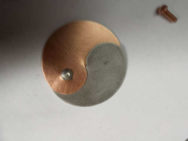 Estás casi listo para fijar el remache... pero primero debe comprobar el ajuste y recortar al tamaño. Vuelva a alinear las dos piezas se clava y empuje un remache a través del orificio. Si la lámina superior es cobre, utilice el remache de aluminio. Si la lámina superior es de aluminio, use el remache de cobre. Asegúrese de que no hay rebabas ni restos debajo de la cabeza del remache o entre las hojas. Mantenga las piezas como cerca de su posición final como sea posible. Habrá algunos ajustes después de establecer, pero muy poco. Manteniendo la presión en la cabeza del remache, utilice cortadores diagonales para cortar la caña del remache que aproximadamente 1/16" está pegando sobre la superficie del metal. Si se corta demasiado corto, sustituir el remache con el otro y cortar otra vez.