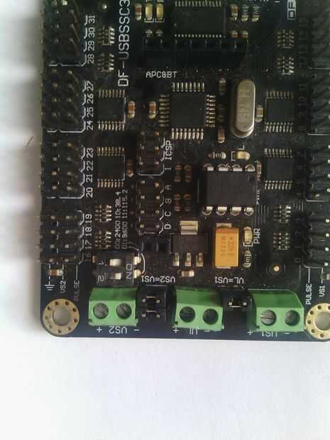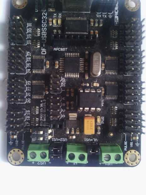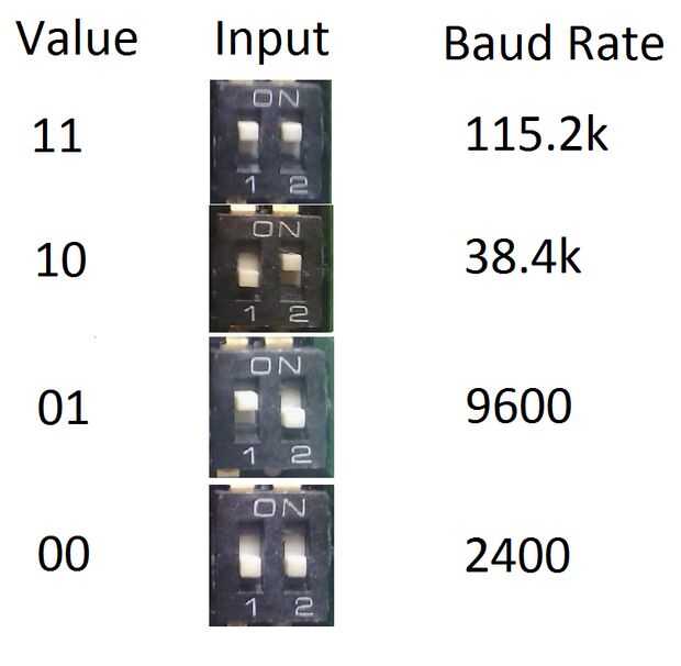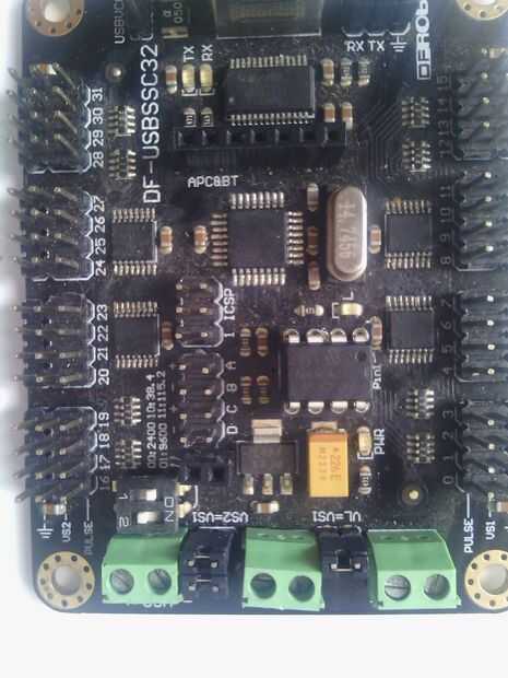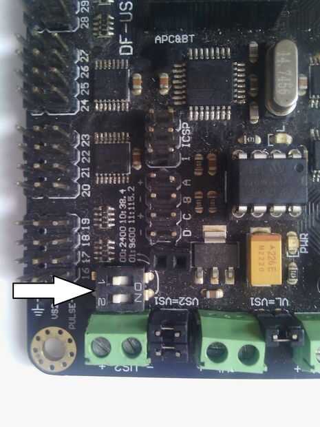 La velocidad en baudios se establece mediante dos métodos diferentes, dependiendo de si el SSC-32 tiene puerto serial DB9 o puerto serie USB. Si el tablero tiene un puerto serial USB como el que estoy usando, cambiar la velocidad en baudios usando las entradas de la tasa de baudios que se asemejan a 2 interruptores como se muestra en las imágenes.
