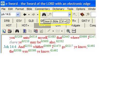 Recordar parte de un verso, pero no puede recordar el verso entero, o donde se encuentra. e-Sword contiene una función de búsqueda. Haga clic en el binocular delineado en amarillo, o usar Ctrl + S