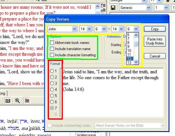 Antes de hacer clic en la copia, tienes la opción de seleccionar cómo el texto se mostrará cuando se pega. Usar opciones 6 y 7 más a menudo. Opción 6 lugares la referencia completa al principio del bloque de texto y luego coloca números individuales verso entre paréntesis que se producen dentro del texto. Opción 7 pega un ininterrumpida bloque de texto con el libro, capítulo y versículo de referencia al final del bloque.