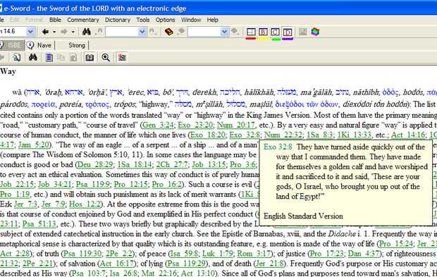 e-Sword utiliza vínculos verde lima para más referencias de pasaje de Biblia. Eso es cierto en todas las ventanas. Mueva que el cursor sobre uno de ellos y una caja aparece con eso paso en él para leer sin entrar en otros lugares. Esta es una característica muy útil. En la captura de pantalla había movido el cursor sobre Exo(dus) 32:8, y apareció en una caja.