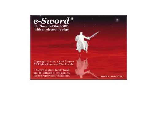 Esta pantalla muestra brevemente al abrir e-Sword. Mientras que e-Sword es gratis, ADVERTENCIA no para vender copias a cualquier persona. Si alguien intenta venderle una copia, tienes que denunciarlo. La ubicación de la página de inicio también se da en esta pantalla, en caso de que olvide.