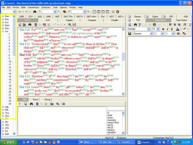 Usé una pesada línea amarilla para delinear el árbol de la Biblia. Es una forma de navegar por los libros y capítulos de la Biblia. Desplácese hacia abajo hasta un libro. Haga clic en el signo "+" a su izquierda, y aparece una enumeración de sus capítulos. Haga clic en un número de capítulo y el texto que se muestra en la ventana principal también conocida como la ventana de la Biblia.