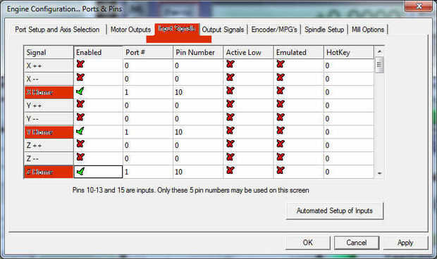 Lo que permite los interruptores se realiza en Mach 3 por seleccionar "Configuración" del menú superior, seleccionar "Puertos y alfileres" el tirar abajo de menú y seleccionando la pestaña de "Señales de entrada". Usted querrá ver que las filas marcadas X casa Y hogar y Z Home, están habilitadas con una marca de verificación verde. Luego asignará cada una de estas filas para "Puerto 10 1 Pin" como se muestra en esta captura de pantalla. Éxito de "Aplicar" y luego "OK"
