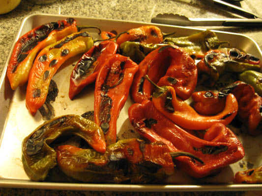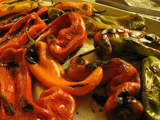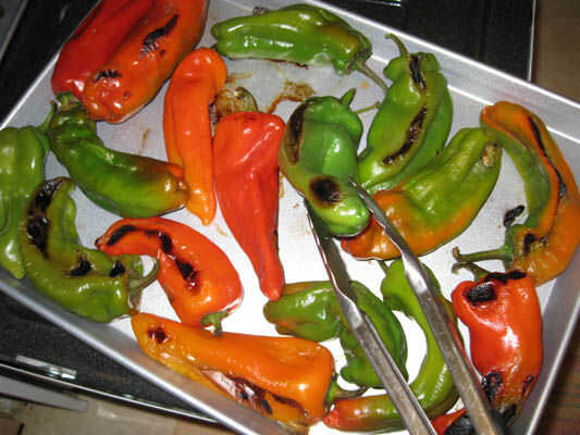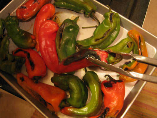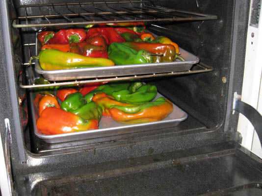 Meter los pimientos en el horno para asar.  Cuando empieza a ennegrecer por un lado (15 minutos), voltearlas y dejarlas terminar de asar.  Cuando son un poco devestadores y ennegrecidos.  Tenga cuidado de no quemarlos!