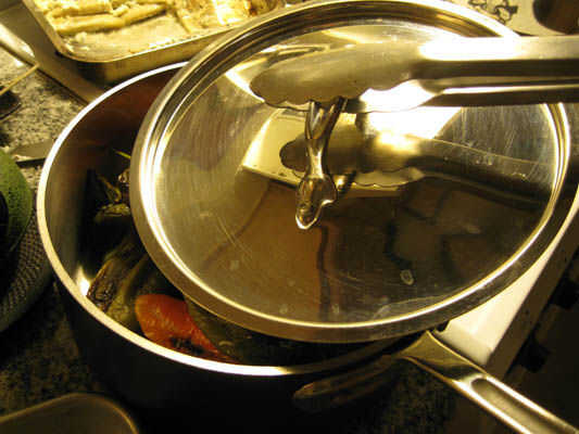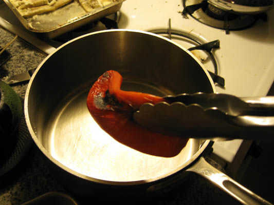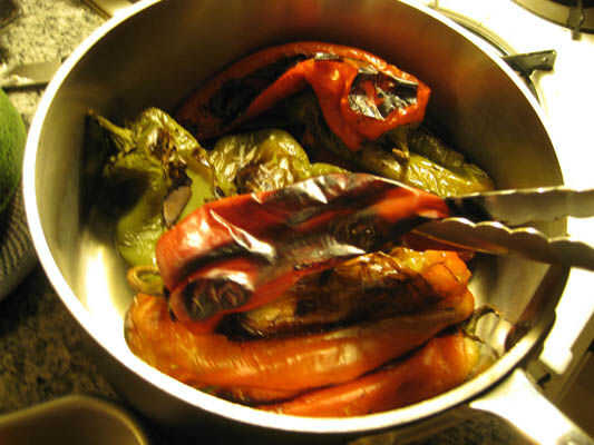 Poner los pimientos asados calientes en una olla con una tapa ajustada al vapor de agua las pieles de. Esto también puede ser hecho con una bolsa de plástico, pero no se recomienda. El vapor escapando de los pimientos picantes harán las pieles salen fácilmente. Mantenga cubierto por al menos 10-15 minutos, pero tiene sentido dejarlos enfriar totalmente, ya que el siguiente paso es pelar!