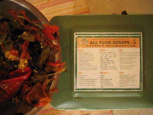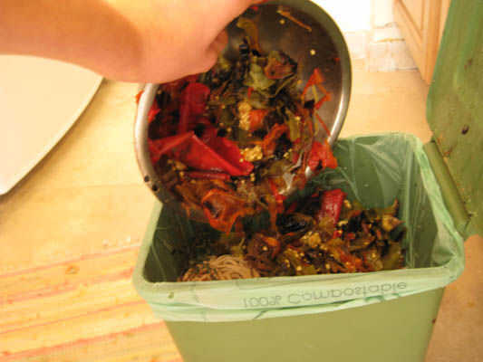 Poner las pieles, tallos y semillas en su recipiente de compostaje o gusano, o darles de comer a los pollos (pollos amor pimiento pieles!).