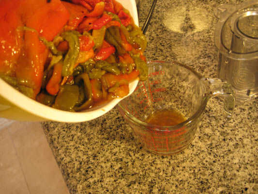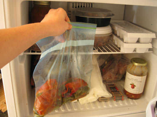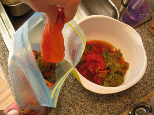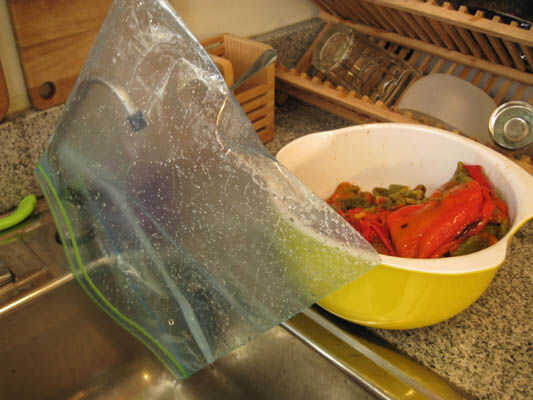 Si usted quiere hacer más adelante el Ajvar , poner los pimientos en una bolsa de congelador y congelarlas.  Cuando estés listo para hacer Ajvar, descongelar los pimientos en un bol, verter el exceso de líquido.