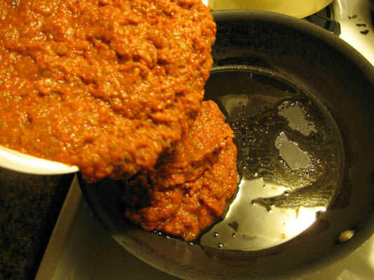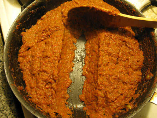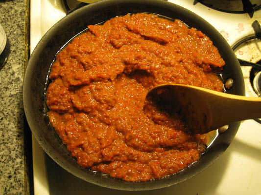Calentar 5 cucharadas de aceite de oliva en una sartén y verter la pasta de pimiento en él.  Cocinar lentamente a fuego lento, añadiendo más aceite. Para 5 kilos de pimientos, tarda cerca de 2/3 de una taza de aceite o más. Tarda unos 45 minutos para cocinar los pimientos para hacer Ajvar. Sabes hacerlo porque ellos Ajvar piezas como el mar rojo (estancias separadas). También cambia el color un poco - resulta más ligero que el original pasta de pimienta. Puedes añadir sal, pero no es necesario.