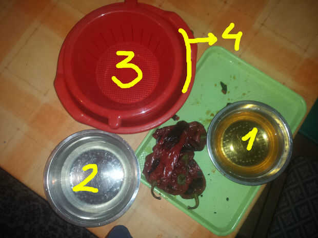 - Un cuenco de agua que se utiliza para quitar las semillas del interior de los pimientos pelados.