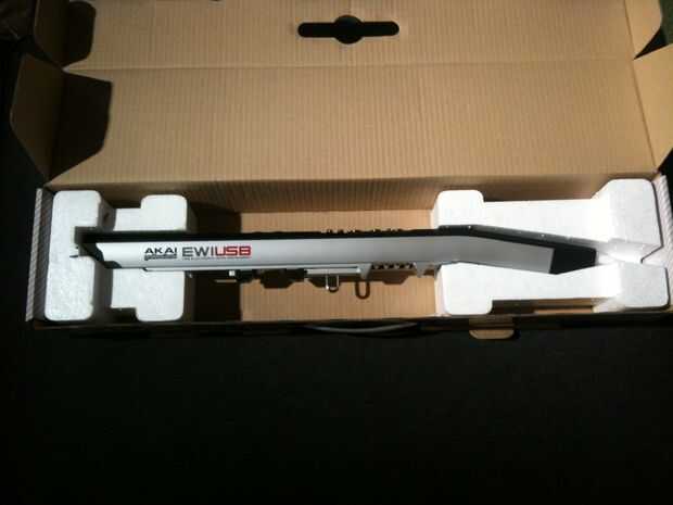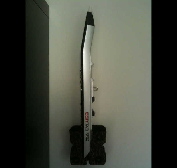A fin de manten orden en el estudio quería encontrar una manera para colgar en la pared y después de ir pensando en esto y me di cuenta de que tenía la base perfecta para un montaje de la pared en la espuma de poliestireno material de embalaje que el dispositivo viene con. Unas horas más tarde tuve esto, una forma básicamente libre, super bien ajustada para mantener el EWI a mano pero fuera del camino.