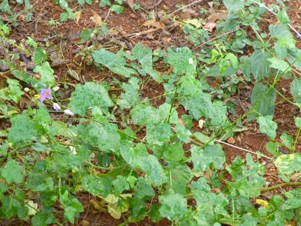 La planta es una enredadera y está llena de espinas, incluso las hojas tienen espinas. Tiene flores de color púrpura y las hojas tienen 3 ó 5 lóbulos. los frutos son aproximadamente un centímetro de tamaño y tienen un montón de semillas en su interior.