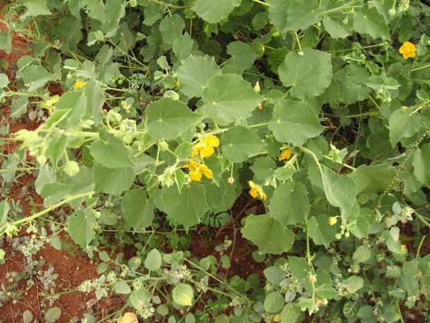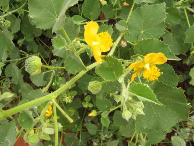 Las hojas de Abutilon indicum son nervadas como una palma y tienen bordes ondulados o aserrados. Las flores son solitarias, emparejada, o tener pequeñas inflorescencias en las axilas de la hoja o hacia las puntas de rama. Las flores son a menudo amarillas o anaranjadas. El fruto es redondeado o semiesférico en forma con muchos segmentos, cada uno conteniendo pocas semillas.