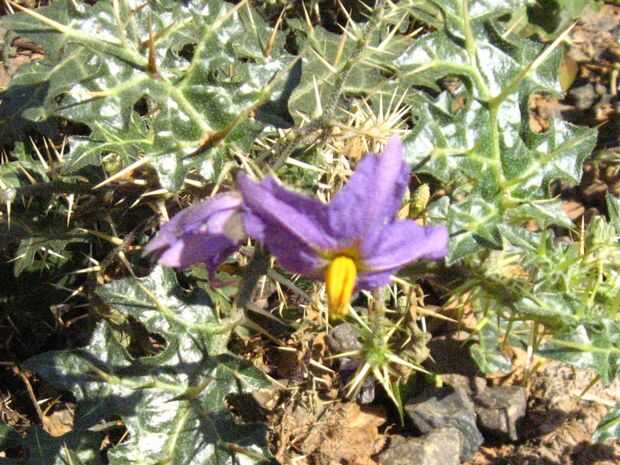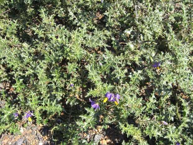 Solano Espinosa es una hierba rastrera, abundantemente provista de robusto, hojas aciculares, de amplia base, que son desiguales y espinoso. Flores son de color púrpuras.