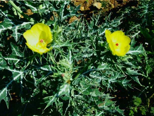 Muy fácil de identificar con su espinosas thistle-como las hojas y flores de color amarillo brillante. Si se rompe un tallo u hoja encontrará un látex amarillo brillante que exuda hacia fuera de los tallos.