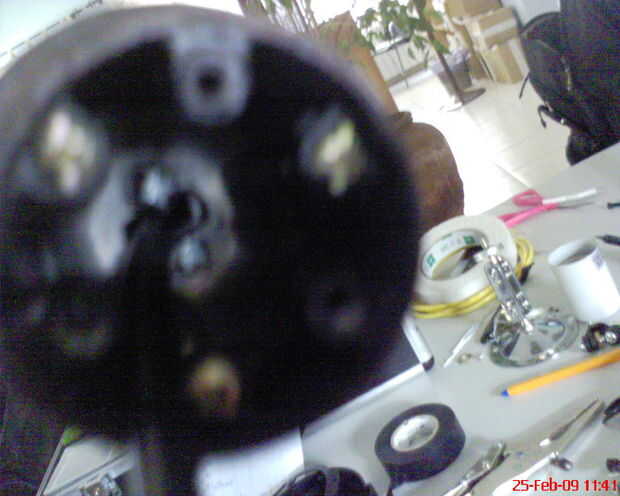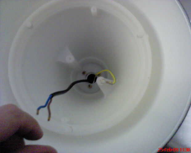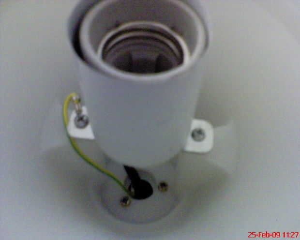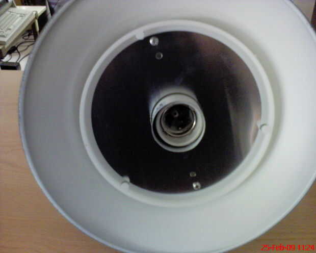 En la segunda foto por debajo del soporte de la bombilla, tres tornillos han de ser eliminados. Esto liberará una forma de campana de plástico grande y la cubierta externa de metal. Mover las dos cubiertas de la campana revelan un sello de goma y un espaciador de Copa decorativa. Dentro de esta Copa son todavía otro dos tornillos a quitar.