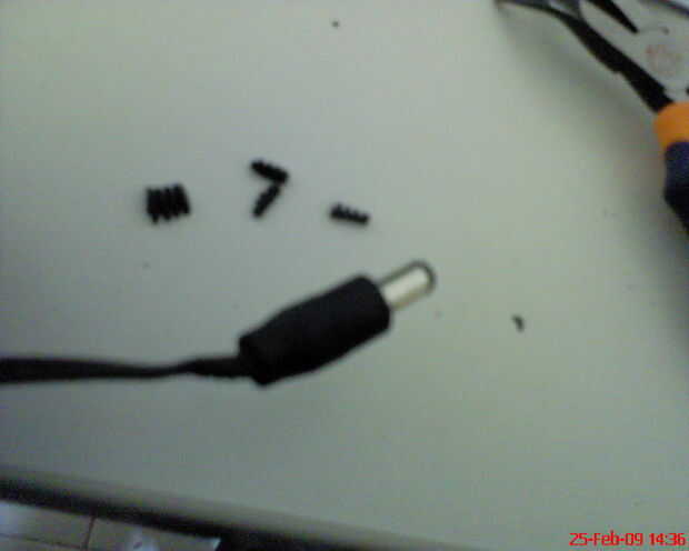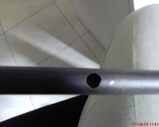 Con los cables y remate quitado se puede ver un agujero de donde salieron los cables. Tuve que hacer el agujero más grande. Suficientemente grande como para pasar el conector de alimentación para la cámara. Una amoladora radial sería genial. Tuve que hacer con algunos cortadores. Esta parte es difícil si no tienes un buen agarre. No tienes que ser demasiado cuidadoso con la anchura del tubo porque los brazos de montaje cubren la mayor parte de él.