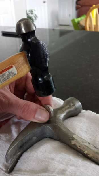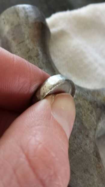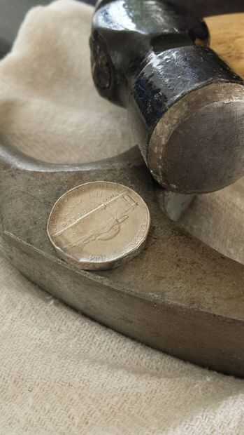 Este proceso es más sencillo de lo que pensaba que sería. Idea de Tomatoskin usar otro martillo como un yunque fue brillante. Simplemente comience tocando alrededor del borde del níquel con el martillo segunda uniformemente hasta setas hacia fuera. Asegúrese de Asegúrese de medir el tamaño que se necesita para la apertura. En un intento de hacer que el anillo más grueso que puede prevenir de tener suficiente espacio para hacer incluso cabe en el dedo previsto.