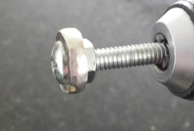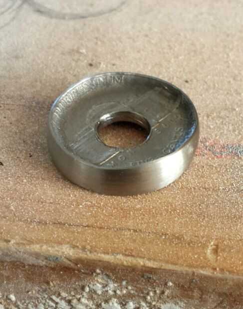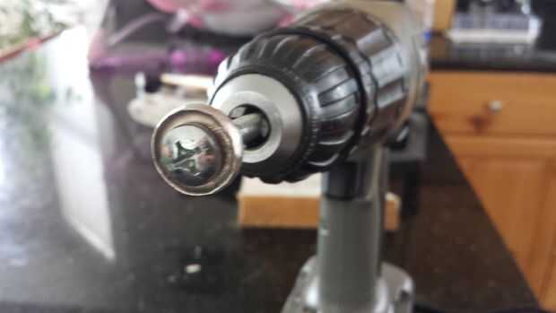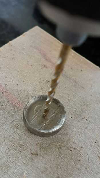 Otra vez, técnica de Tomatoskin es genial aquí. Perfore un agujero en el centro del níquel lo suficientemente grande para el tornillo a través del palillo. Luego coloque el tornillo a través del níquel y apretar con la tuerca. Meter el tornillo en el taladro y ahora tienes la forma más fácil de lijar y pulir el níquel imaginable.