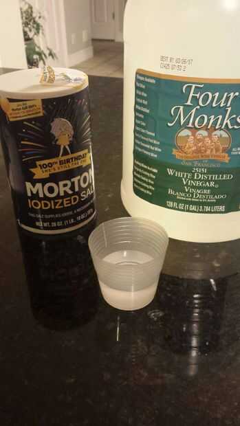 Para empezar, vierta una pequeña cantidad de vinagre en una taza. Luego vierta algo de sal y se mezclan. La cantidad exacta no es tan importante. Pongo en aproximadamente una cucharada cafetera. Deje la sal saturada.